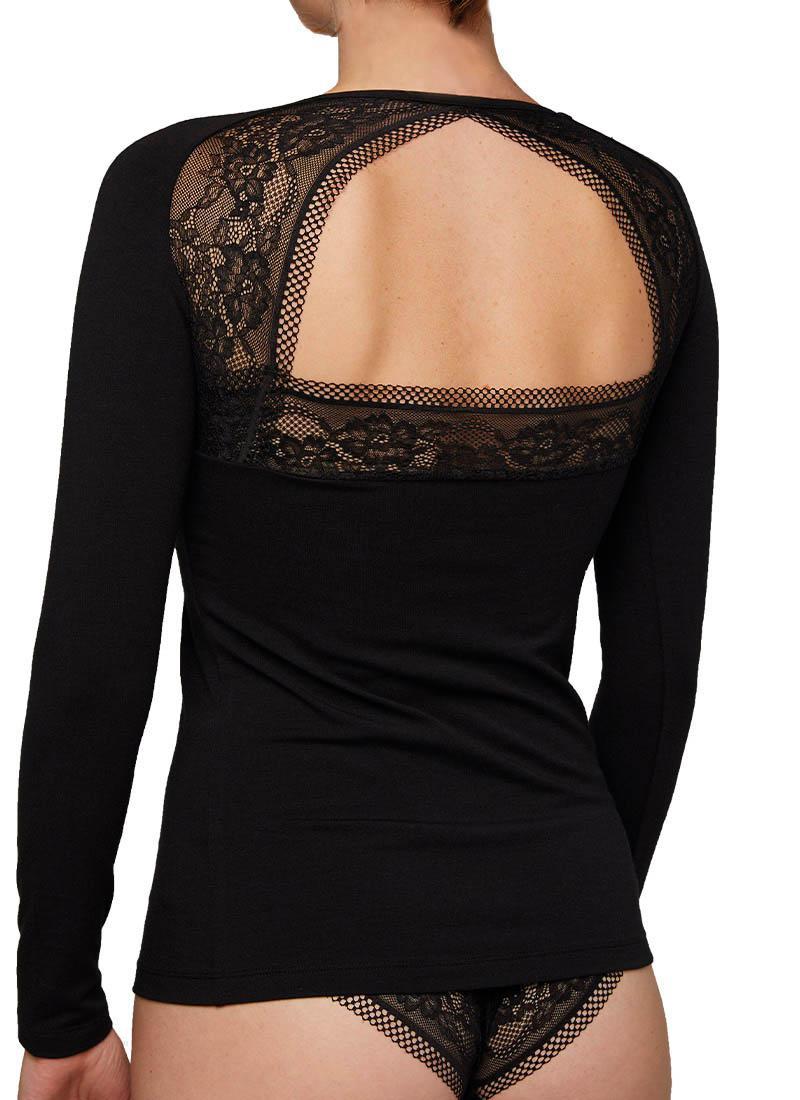 Bawełniana koszulka z długim rękawem. Dekolt z tyłu ozdobiony kawałkami koronki, nie można się oprzeć.