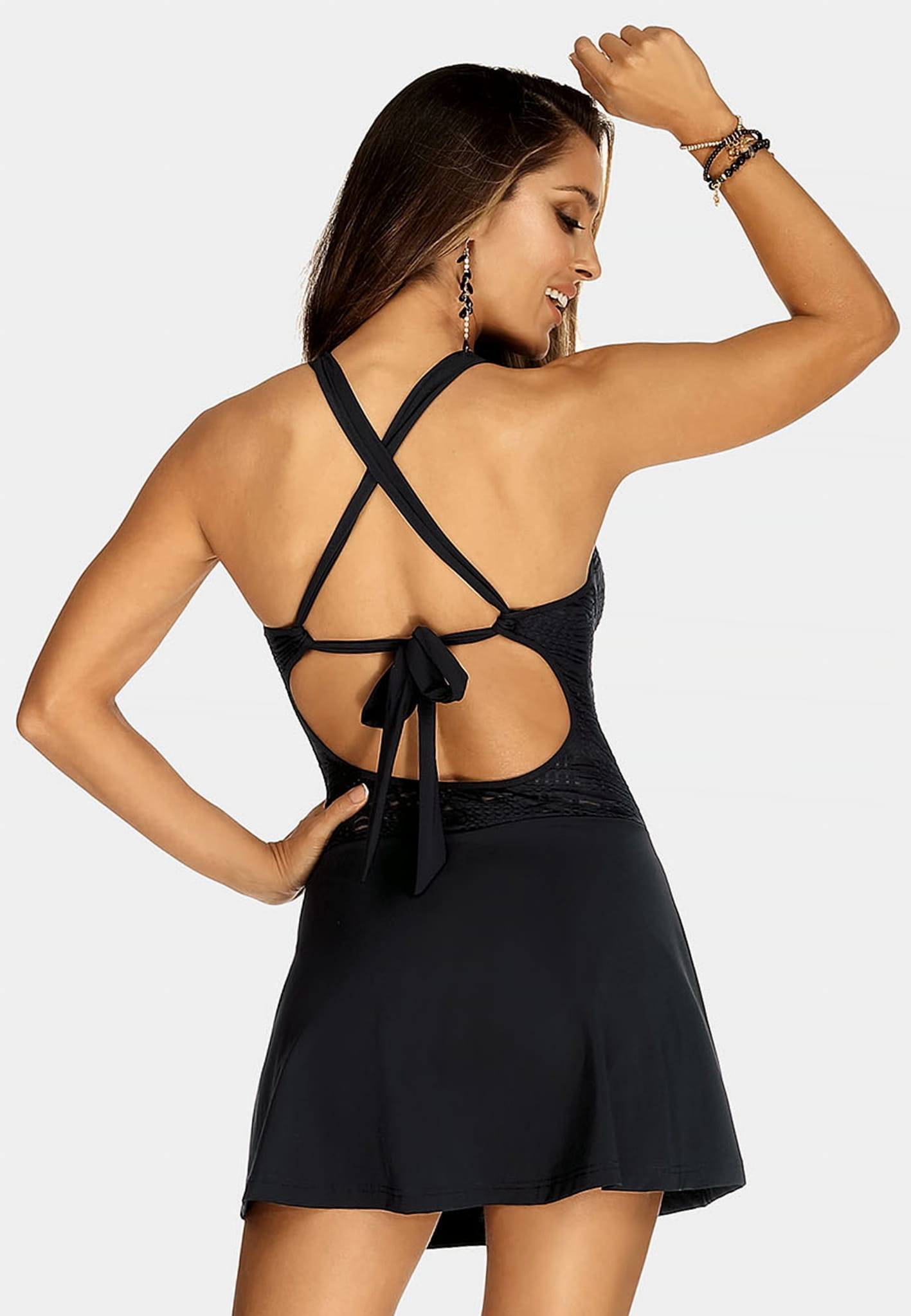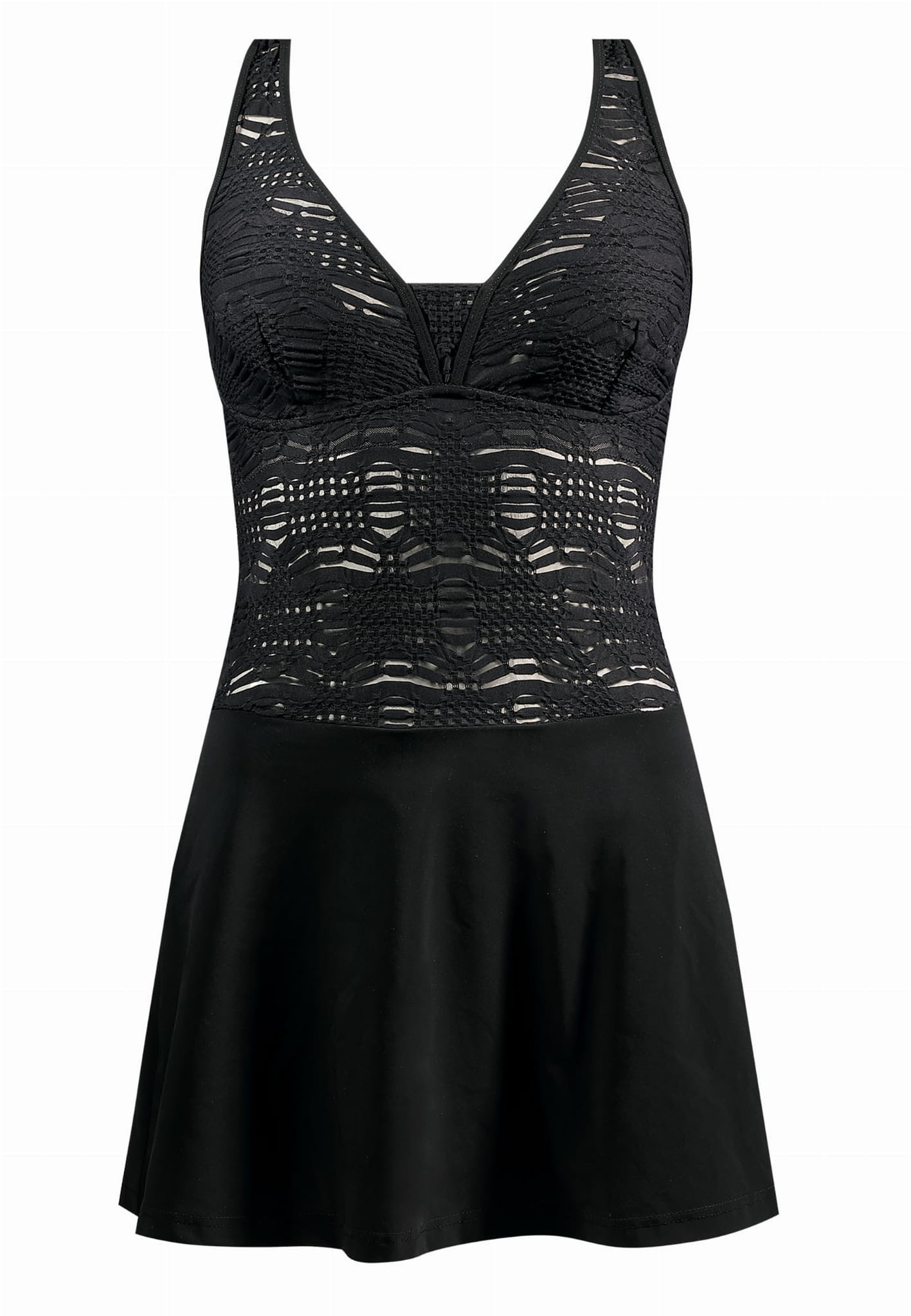 Jednoczęściowy ażurowy kostium kąpielowy ze spódniczką w klasycznej czerni