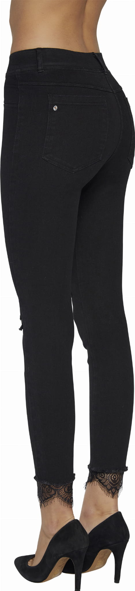 Modne Legginsy z efektem push-up w jeansowym stylu. Kieszenie tylne zostały wszyte w sposób, który widocznie uniesie Twoje pośladki, ozdobione kryształkiem Swarovski. Przetarcia na kolanach oraz ozdobna koronka na zakończeniu nogawek, nadają indywidualny charakter.