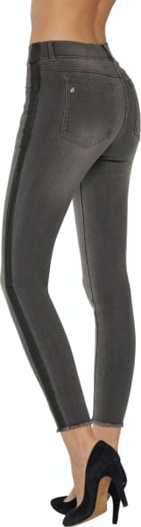Modne Legginsy z efektem push-up w jeansowym stylu. Model wykończony modnym ciemnym lampasem oraz zdobiony kryształkiem Swarovski. Kieszenie tylne zostały wszyte w sposób, który widocznie uniesie Twoje pośladki. Elastyczne wykonanie w pasie dla lepszego dopasowania.