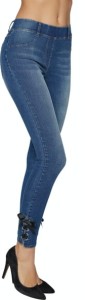 Jegginsy Push-up wykonane z jeansowego materiału, z ozdobnymi wstązkami w dołach nogawek. Ozdobione kryształkiem Swarovski.