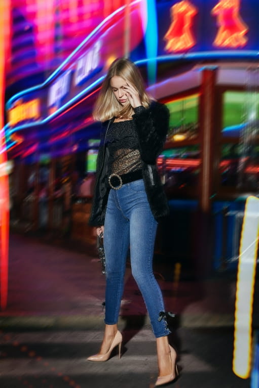Modne Legginsy z efektem push-up w jeansowym stylu. Krój klasycznych jeansowych rurek. Doły nogawek ozdobione taśmą wiązaną we wstążkę, która łączy dwie strony materiału. Dodatkowo w tynlniej części przyozdobione kryształkiem Swarovski. Kieszenie tylne zostały wszyte w sposób, który widocznie uniesie Twoje pośladki. Materiał elastyczny, dopasowuje się do sylwetki.