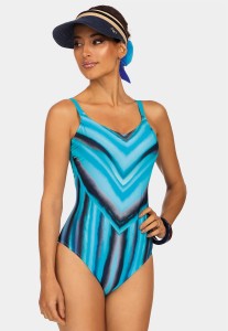 Fason posiada wszyte wewnątrz miseczki z miękkiej, szybkoschnącej siateczki o jednym cięciu pionowym, oparte na fiszbinach, które solidnie stabilizują piersi. Szersze, regulowane ramiączka i wbudowane fiszbiny, przy odpowiednio dobranym rozmiarze, zapewnią perfekcyjne uniesienie i podtrzymanie biustu. Przy dekolcie ozdobne marszczenie, plecy wycięte w kształcie litery U. Zabudowane miski dadzą poczucie komfortu i bezpieczeństwa, zapewniając większą swobodę ruchów. Kostium w części przedniej i tylniej wykonany został z tkaniny w morski print. Pionowe pasy z przodu oraz tyłu sprawiają, że Twoja sylwetka będzie optycznie wyglądać szczuplej, a boczki i wydatniejszy brzuszek znikną niezauważone.