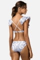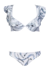 Kostium kąpielowy typu bikini z miseczką p-up / soft, niezwykle miękkiej. Model ten doskonale uwydatnia biust, "falbanka" dodaje lekkości i kobiecości. Fason z zapięciem pod biustem, regulowanymi ramiączkami odpinanymi tylko z tyłu. Ramiączka można: zawiązać na szyi, zawiązać na krzyż lub klasycznie. Figi klasyczne.