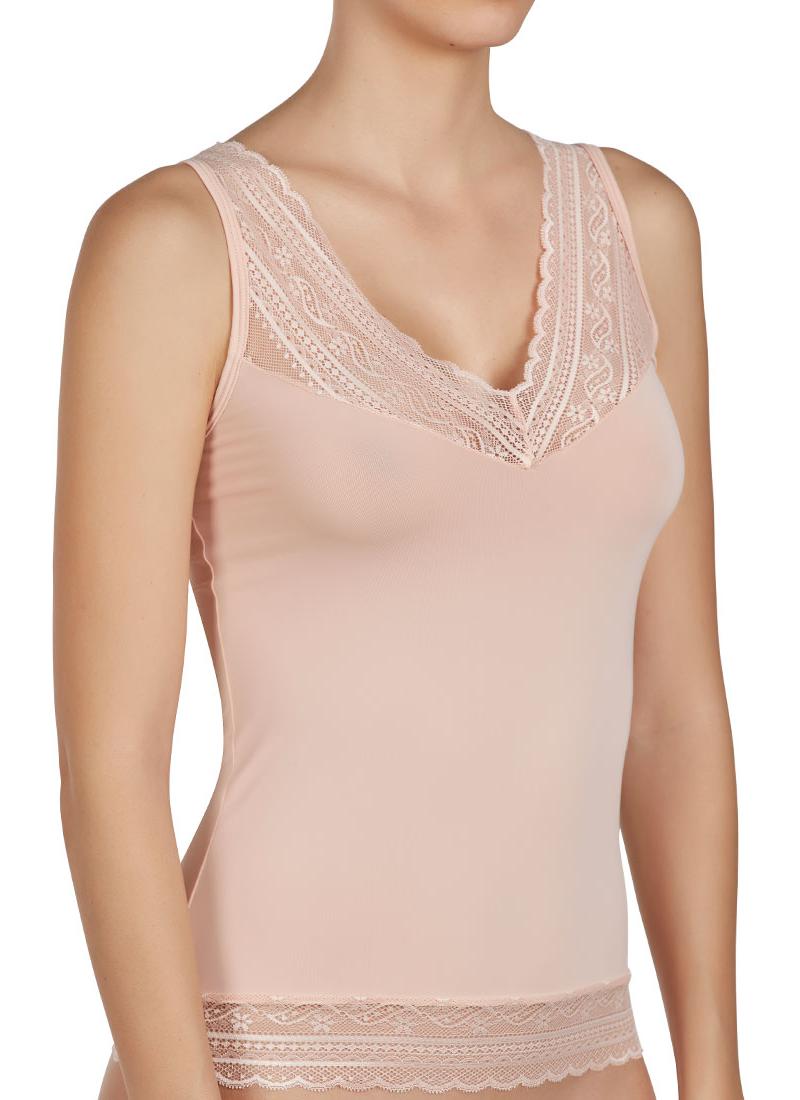 Koszulka bez rękawów Kolekcja Romance. Kobiecy i zmysłowy. Miękka tkanina z mikrofibry o wysokiej elastyczności. Delikatny krój z koronkowymi zdobieniami łączą jakość i elegancję.