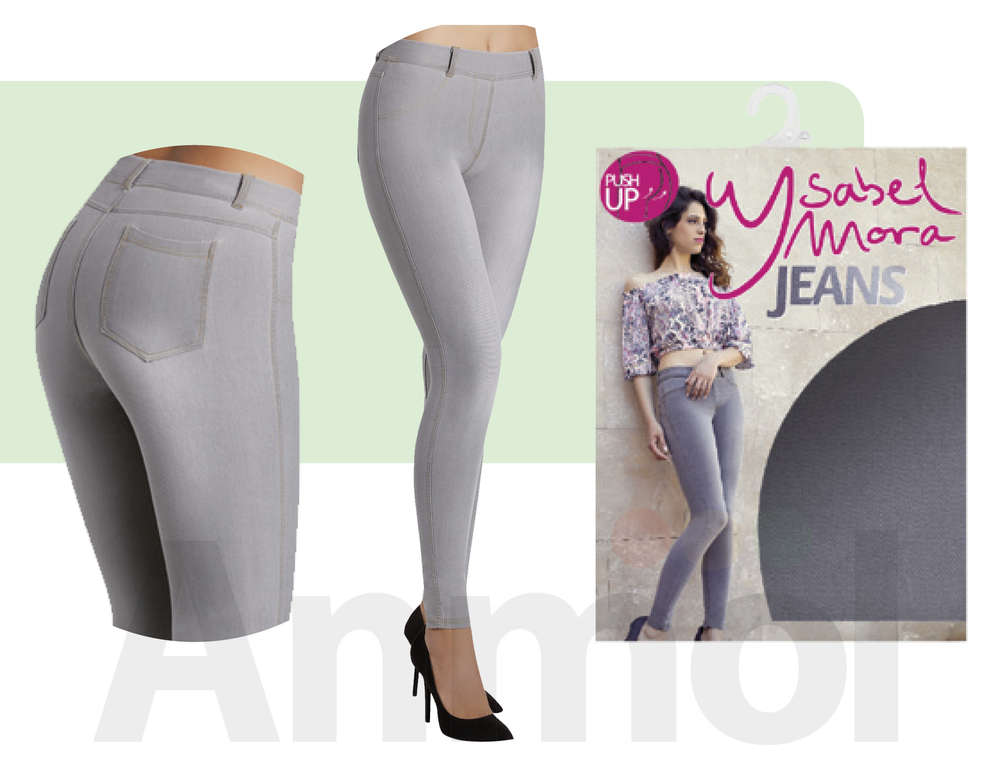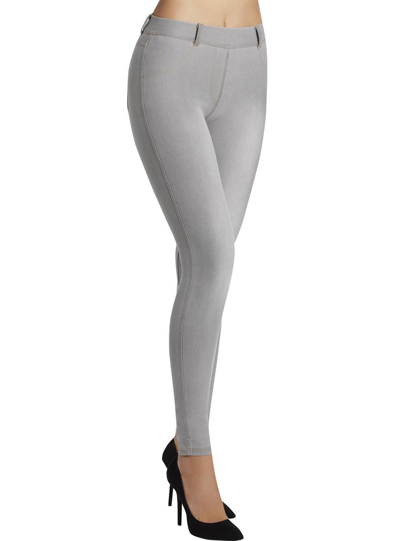 Modne Legginsy z efektem push-up w jeansowym stylu, w kolorze szarym. Materiał elastyczny, dopasowuje się do sylwetki. Tylne kieszenie zostały naszyte w sposób, który powoduje optyczne uniesienie pośladków.