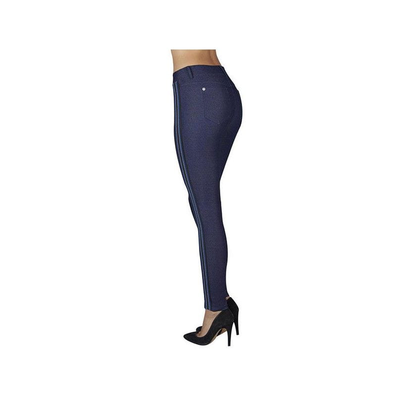 Legginsy wykonane z wysoceelastycznego materiału imitującego jeans. Kolor ciemnogranatowy oraz lampas umieszczony z boku optycznie wyszczuplają sylwetkę.