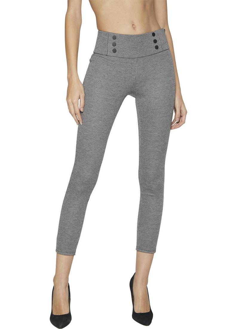 Modne Legginsy z efektem push-up wykonane z miękkiej elastycznej dzianiny. Krój klasycznych rurek, dopasuje się idealnie do Twojej sylwetki. Posiadają zameczek z boku na biodrze, w celu wygodnego ubierania. Posiadają szeroki pas w górnej części ozdobiony czarnymi guziczkami, wygląda bardzo efektownie, dodatkowo optycznie spłaszczy brzuszek. Dzianina we wzór bardzo modnej drobnej pepitki.