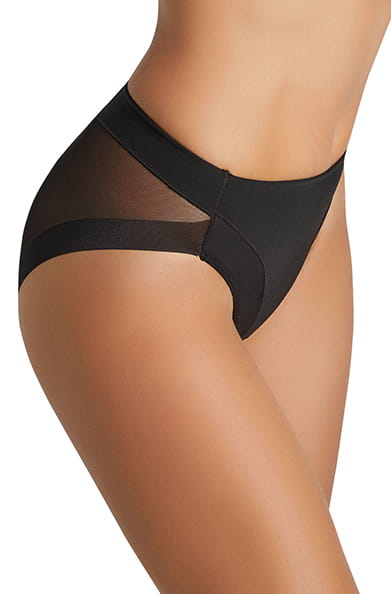 Majtki wyszczuplające o niższym stanie. Doskonale przylegające do talii. Środkowa część została wzmocniona w dolnej częśc, aby uzyskać efekt płaskiego brzucha. Na pupie wykonane z cieniutkiej siateczki, nie odbijają się na ubraniu, dając efekt stringów. W kroku posiadają wkładkę frotte wykonaną 100% z bawełny. Dostępne w kolorze: czarny, cielisty beż