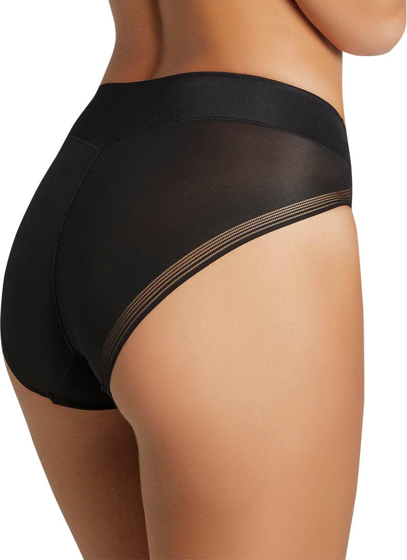 Majtki wyszczuplające podstawowe. Doskonale przylegające do talii. Środkowa część została wzmocniona w dolnej części, aby uzyskać efekt płaskiego brzucha. Na pupie także wykonane ze ściągającego materiału, jednak wykończone zostały ultrapłaskim szwem więc nie odbijają się na ubraniu. W kroku posiadają wkładkę frotte wykonaną 100% z bawełny. Dostępne w kolorze: czarny, cielisty beż