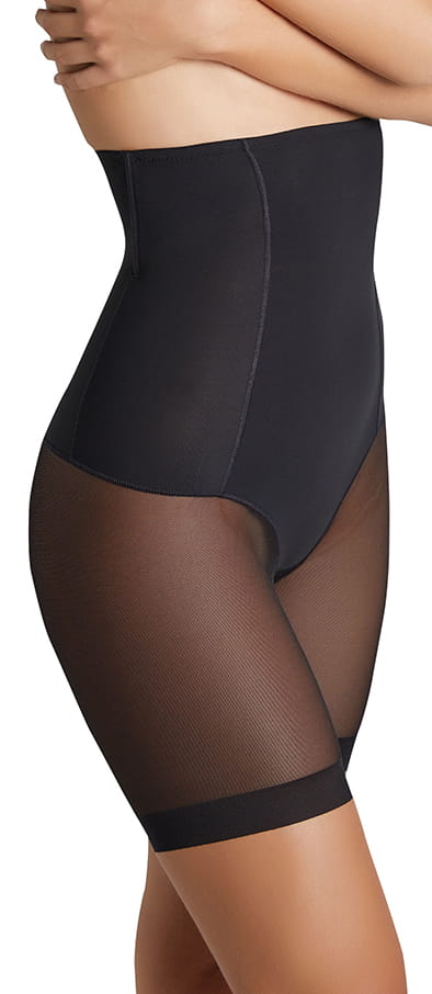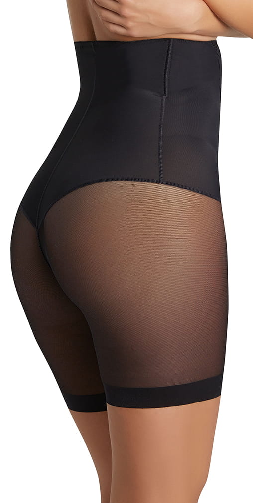 Majtki o wysokim stanie, wykonane z mocno ściągającego materiału. Doskonale przylegające do talii, z wzmocnioną dolną częścią, aby uzyskać efekt płaskiego brzucha. Wykończone u góry taśmą silikonową, dzięki czemu nie zsuwają się. Na pupie wykończone delikatną siateczką, dającą efekt stringów. Delikatna siateczkowa nogawka zapobiegnie obcieraniu ud, dając Ci uczucie komfortu. Posiadają wszytą w kroku wkładkę frotte wykonaną 100% z bawełny. Dostępne w kolorach: czarny, cielisty beż.