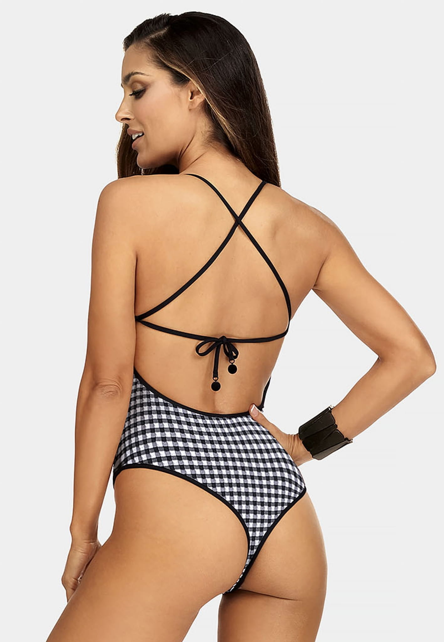 Wycięty strój kąpielowy wiązany na plecach w kratkę vichy