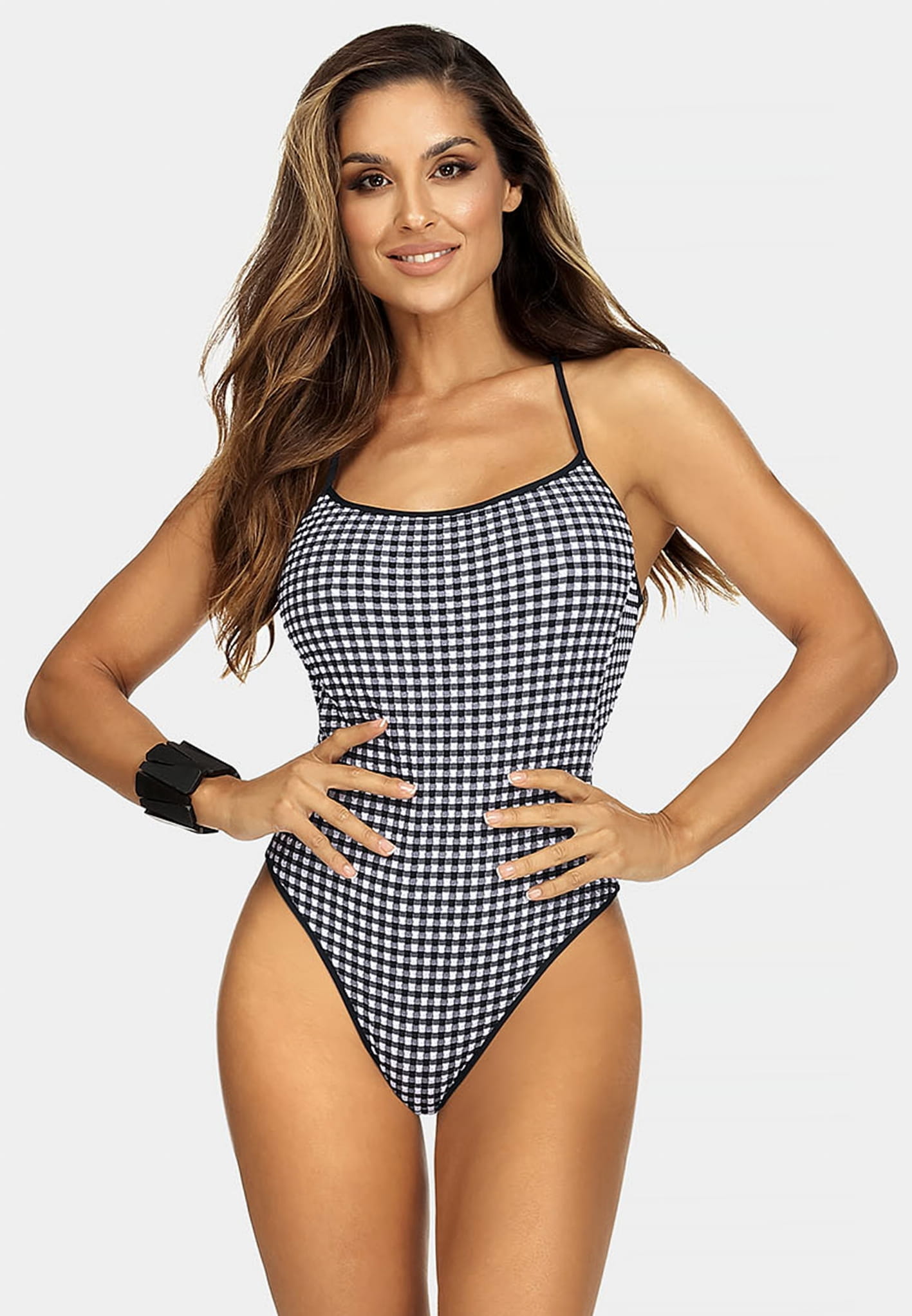 Chcesz również na plaży wyglądać modnie, kobieco i oryginalnie? Jeśli tak, to polecamy Ci ponadczasowe stroje kąpielowe w kratkę, które wykonaliśmy przy użyciu naprawdę wyjątkowej tkaniny. Wzór kratki vichy to trend z lat 50-tych, był w szczególności uwielbiany przez znaną ikonę stylu Brigitte Bardot. Połączenie klasycznej czerni z kontrastującą bielą nadaje kostiumom kąpielowym eleganckiego charakteru. Na dodatkową uwagę zasługuje ciekawy rodzaj tkaniny — jest bardzo przyjemna w dotyku, materiał posiada strukturę 3D o bardzo lekkiej formie (po kontakcie z wodą nie zmienia swojego kształtu).
